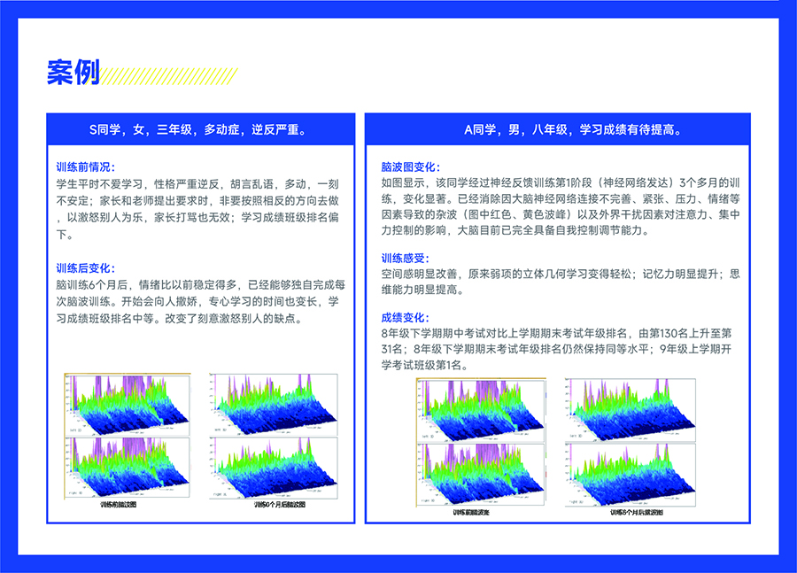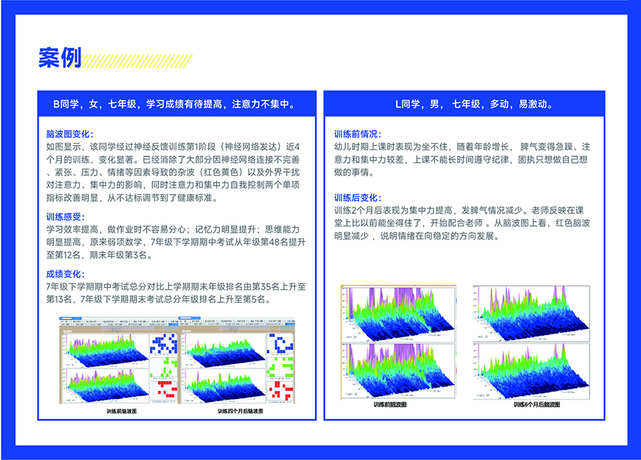 A:其实每个孩子都可以通过神经反馈训练来让大脑功能均衡发展,但以下情况的孩子急需进行训练:1)上课走神,注意力不集中,课堂效率差(脑能量不足,SMR低)