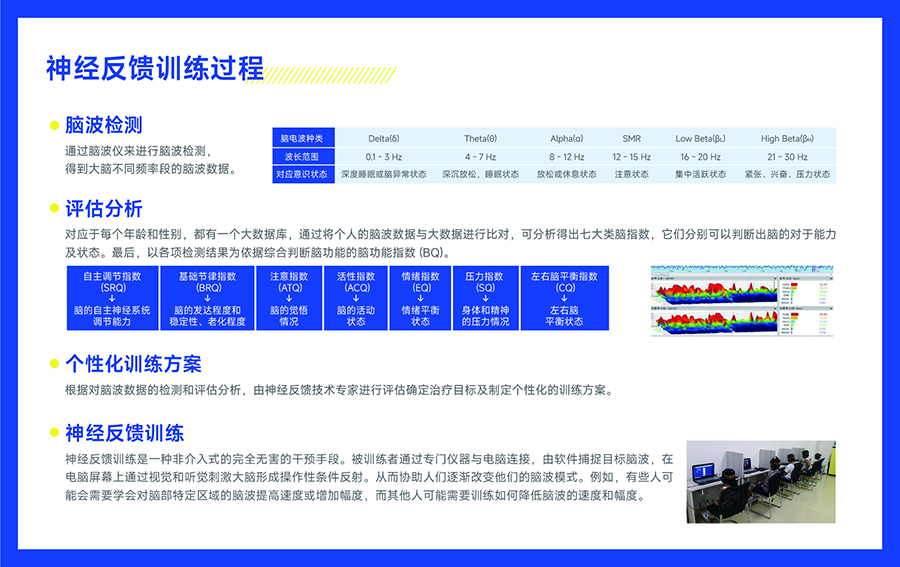 A: 神经反馈训练是先进的脑潜力开发技术,通过检测人的脑电波,然后针对大脑神经功能的薄弱环节,通过专门制定的脑训练程序来提高大脑功能及利用效率。该项技术是韩国精神科学研究所在充分借鉴美国、德国、英国等发达国家在脑科学方面的最新研究成果的基础上,汲取发达国家贵族子女教育方式精髓,结合亚洲人群的特点,研发出对5一18岁青少年脑功能均衡发展的系统训练方法。训练方式:通过BQ检测技术,对孩子大脑的基础节律、自主调节指数、注意力指数、情绪指数、抗压力指数、活跃指数、左右脑平衡指数等7大类指标进行检测,并针对孩子出现的注意力、专注力、脑发育基础、记忆力及左右脑平衡等问题,通过国际先进的脑波训练仪,对孩子有针对性的展开训练,进一步解决孩子的注意力不足、专注力较弱、左右脑不平衡、创造力不够等学习面临的多项问题。有效率超过85%,且安全长效。