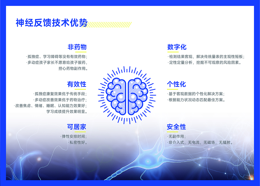 A:神经反馈训练是目前世界上最为先进的大脑训练技术,它不仅能抑制消极情绪,更重要是能有效地提升注意力,增强大脑自主调节能力,强化认知,提高思维能力。古人常说,“身心一体”,也就意味着改变我们的大脑就能改变我们的身心。如果经常通过神经反馈来锻炼大脑神经,焦虑,压抑,紧张及多动症等等生理问题都能得到缓解甚至完全解决。譬如,对于一个长期依靠药物来控制情绪障碍及多动症学生来说,脑波训练能调整好他们大脑神经所造成的生理问题,增强自控力,然后能减少对药物的依赖。此外,对正在服用药物的多动症学生来说,如果结合脑波训练,能够将药效发挥得更好。