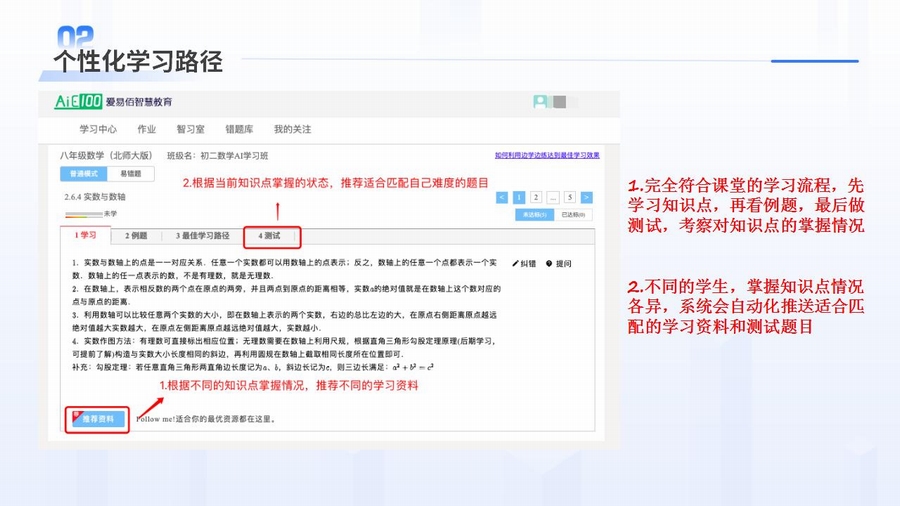 爱易佰智慧校园自适应学习系统对学生当前学习水平进行知识诊断,为学生定制专属知识图谱,自适应学习引擎动态规划最佳学习路径,智能推送符合学生水平的学习内容,致力于为每个学生提供个性化学习解决方案。同时生成学情分析报告为教师提供个性化教学方案,真正实现因材施教。